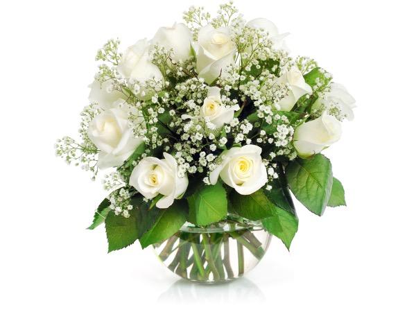 Viehättävä kimppu pienistä valkoisista ruusuista ja hardokukasta.